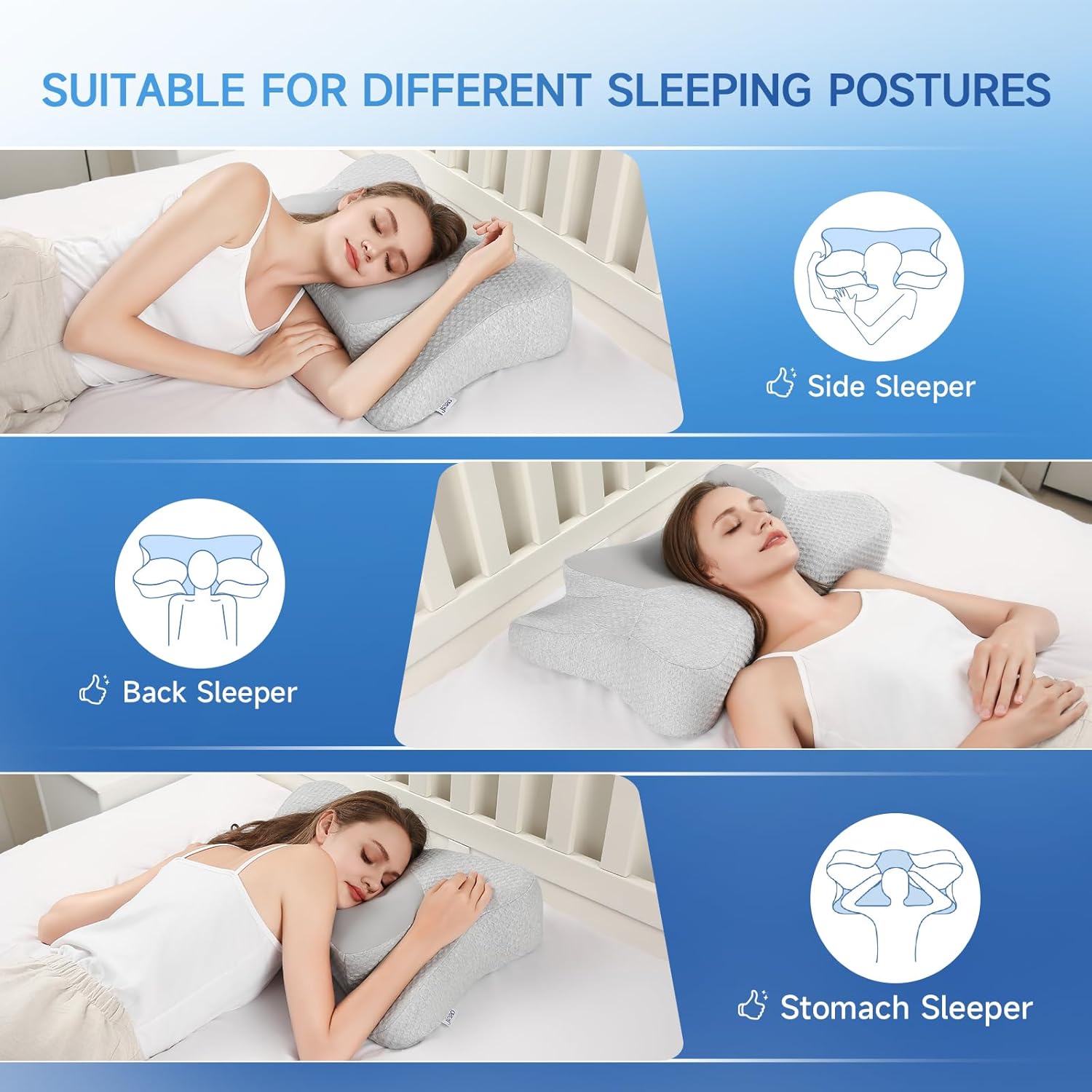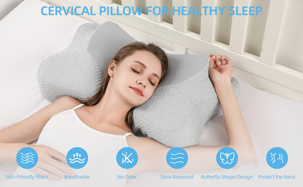 - 【Patented Ergonomic Design】Butterfly memory foam pillows, using the neck raised design and head design to form a height difference to fit the physiological curve of the cervical spine. The central cavity properly supports the head, facilitates alignment of the head with the body and spine, so that the whole body spine in its natural position, you can always find the most comfortable position to sleep in, regardless of whether you are a side, stomach, or back sleeper.